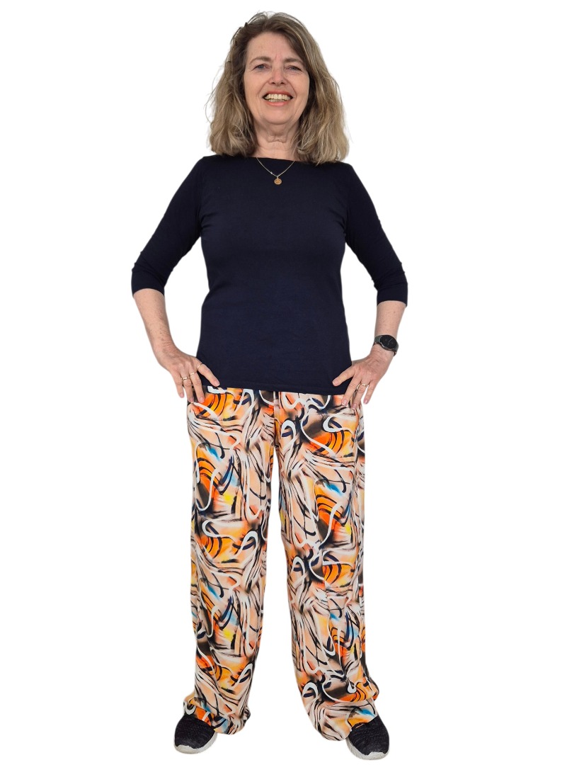 Deze broek heeft vele kleuren (oranje, licht- en donkerblauw, zwart, wit en geel), waardoor u steeds kan varieeren met effen shirts of blouses in genoemde kleuren!