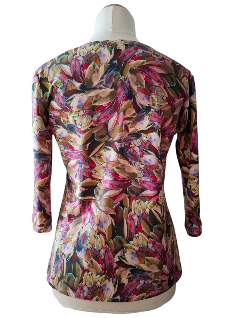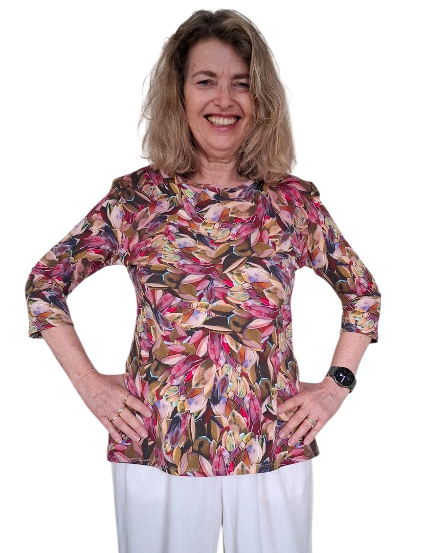 De Colored Leaves shirt heeft een slank model met ruimte voor de buik. Het model heeft lange mouwen en een ronde hals. De schouderbreedte is 11 cm. De lengte van de mouwen is ongeveer 42 cm. en de lengte van het shirt is ongeveer 62 cm. De stof is zowel in de breedte als in de lengte rekbaar, waardoor het shirt comfortabel draagt De stof voelt zacht aan en is geschikt voor het najaar, de winter (met eventueel een jasje of een vest) en in het voorjaar als het nog een beetje fris is.
