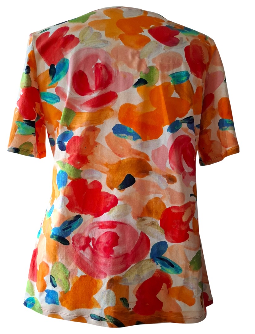 Van dit ColoredShirt word je toch vrolijk? Het shirt heeft o.a. oranje , rode, roze,en een beetje blauwe kleuren op een witte ondergrond. Het lijkt wel geschilderd! Dit shirt heeft een slank model, een ronde hals en lange, korte mouwen. De mouwen vallen net boven de elleboog. De lengte van het shirt is ongeveer 62 cm. en de lengte van de mouwen is ongeveer 28cm.