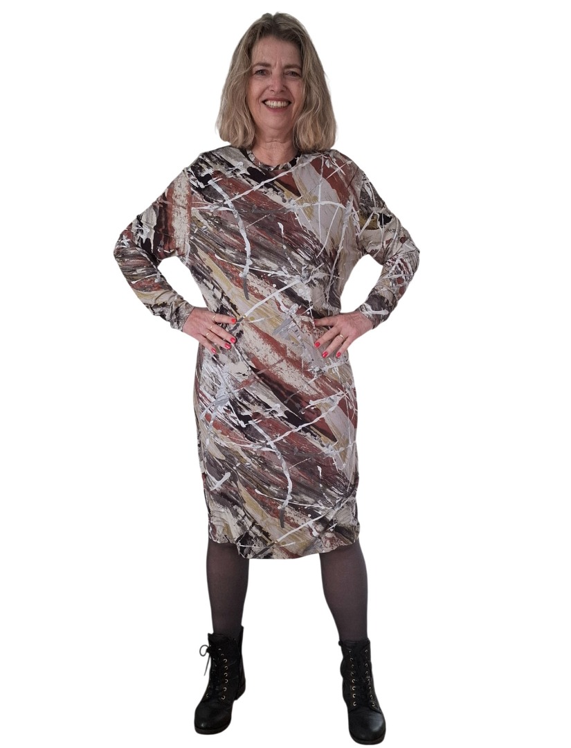 Deze Brushstrokes jurk  heeft een schitterend penseelachtig motief met prachtige bruine tinten! De jurk heeft een slank model, maar wel ruimte voor 'de buik'. De jurk heeft lange mouwen en een ronde hals. De jurk valt soepel en draagt comfortabel omdat het rekbaar is. Ook van deze jurk heb ik maar enkele stuks gemaakt!