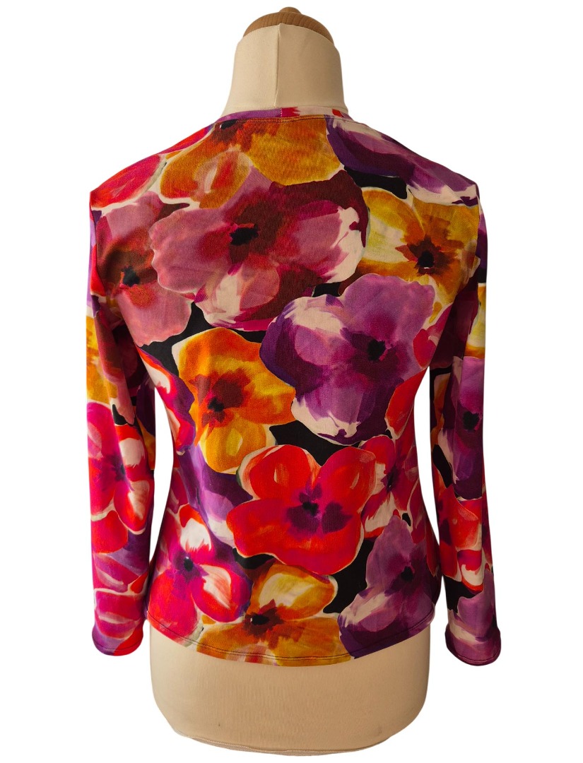 Het shirt op de paspop is een Medium. Dit shirt is van hetzelfde model en stof, ook verkrijgbaar in een langere variant en alleen in de maat Medium. Kijkt u dan bij Bloemen!