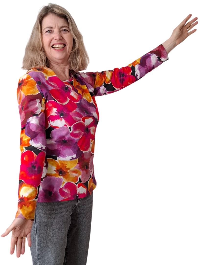 Ook van het Bloemen2 shirt, bedenk ik het model, teken het patroon, zoek een aparte, kleurrijke stof , die comfortabel draagt. Vervolgens begint het maakproces: knippen en naaien. De foto's maken en de gegevens over het kledingstuk, op de website zetten. Vervolgens maak ik een advertentie en zet deze op mijn eigen pagina bij Facebook, bij de groep Pijnacker-Nootdorp en op Instagram (Colorfulclothesonline).