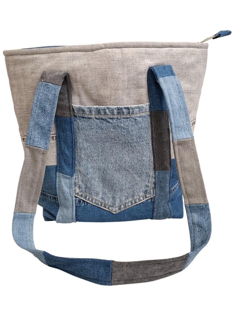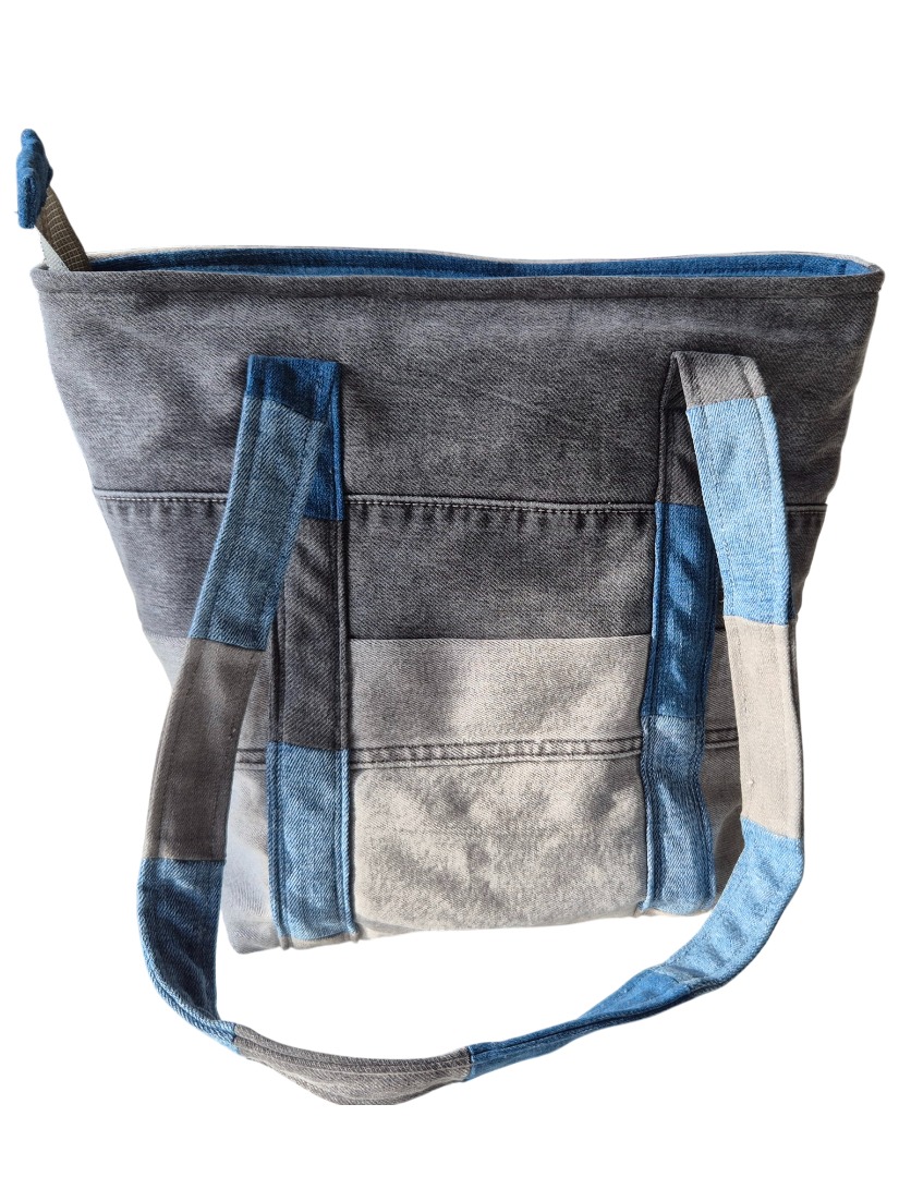 Aan de voorkant en aan de achterkant zitten hengsels gestikt, bestaande uit ieder 16 stukjes verschillende tinten blauwe en grijze spijkerstof. Ieder hengsel is ongeveer 1.40 m. (vanaf de onderkant van de tas, van links naar rechts).