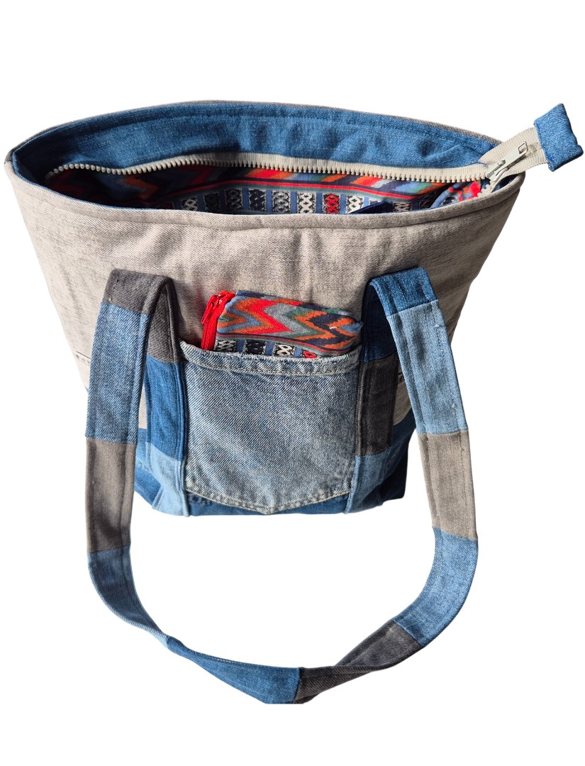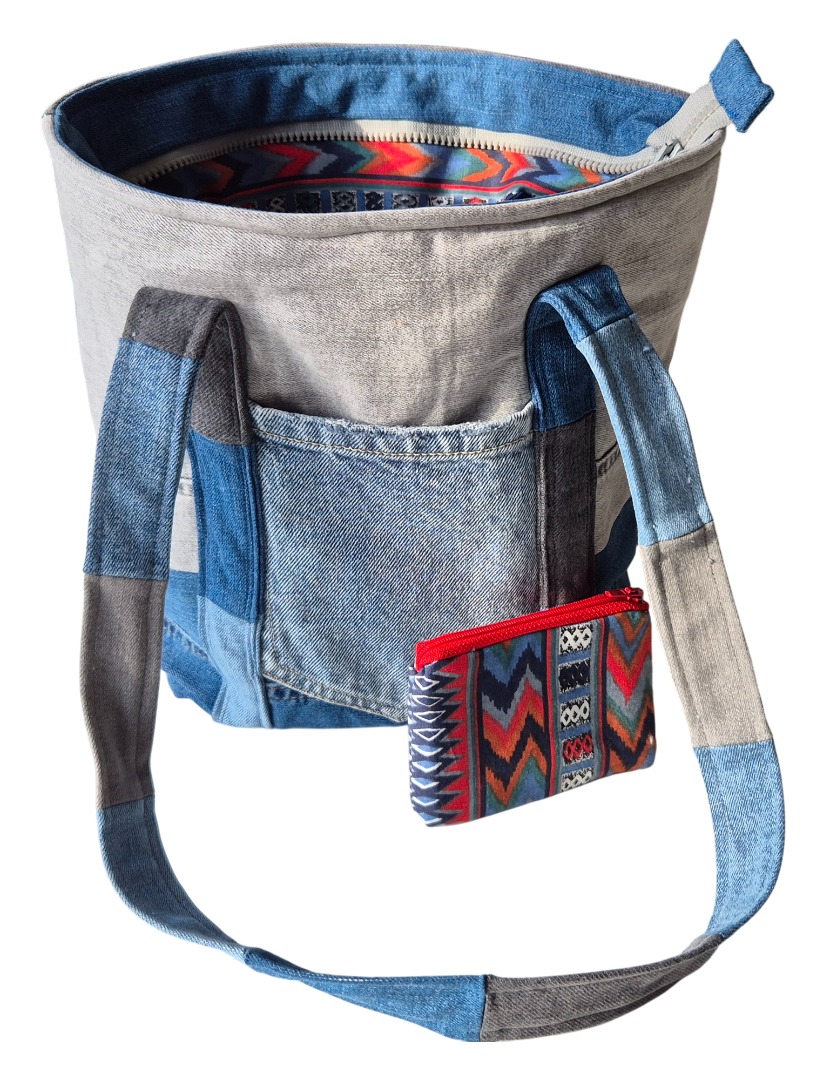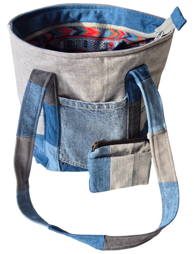 Van eigen en gekregen spijkerbroeken maak ik tassen, tasjes en portemonnees. Met de restanten stof (van de kleding die ik maak of van coupons) voer ik en/of versier ik de tassen.