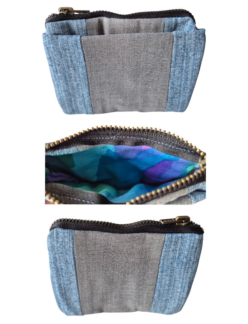 Dit leuke, handige en handgemaakte portemonneetje met pasjesvak is ongeveer 8 cm. hoog en 12 cm. breed. De portemonnee is van gedragen spijkerbroeken gemaakt (upcycling) met een gekleurde voering. Ik heb gebruik gemaakt van verschillende tinten spijkerstof : lichtblauw en grijs.