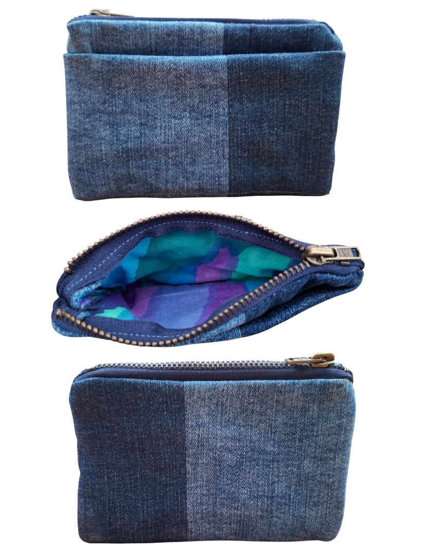 Dit leuke, handige en handgemaakte portemonneetje met pasjesvak is ongeveer 8 cm. hoog en 12 cm. breed. De portemonnee is van gedragen spijkerbroeken gemaakt (upcycling) met eenzelfde voering. Ik heb gebruik gemaakt van verschillende tinten spijkerstof : midden- en donkerblauw.
