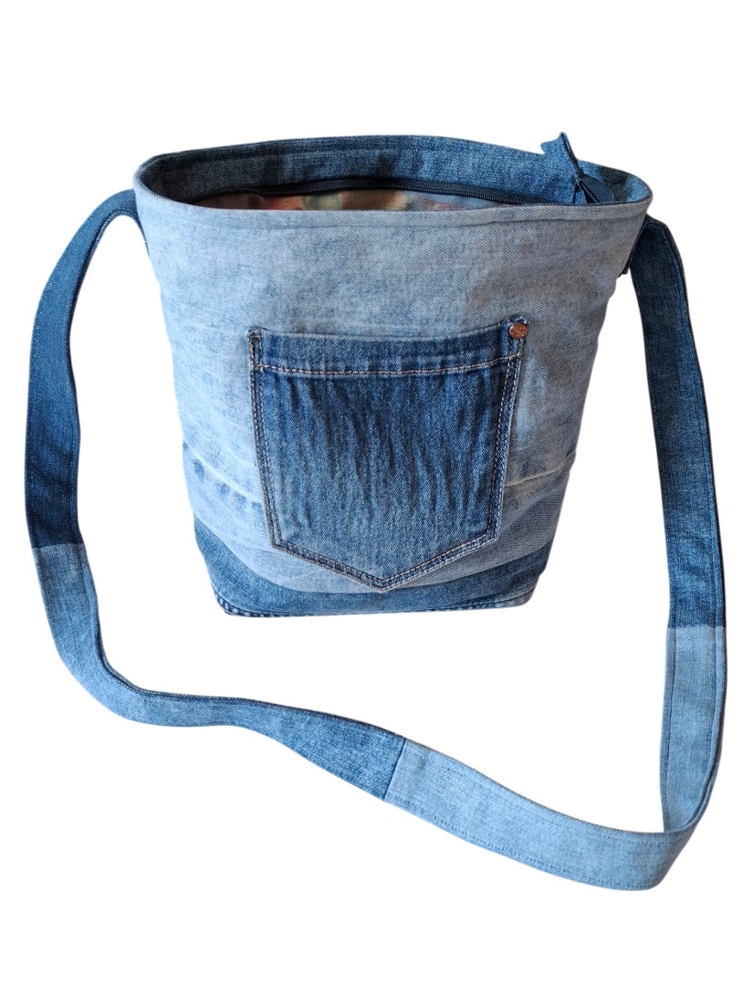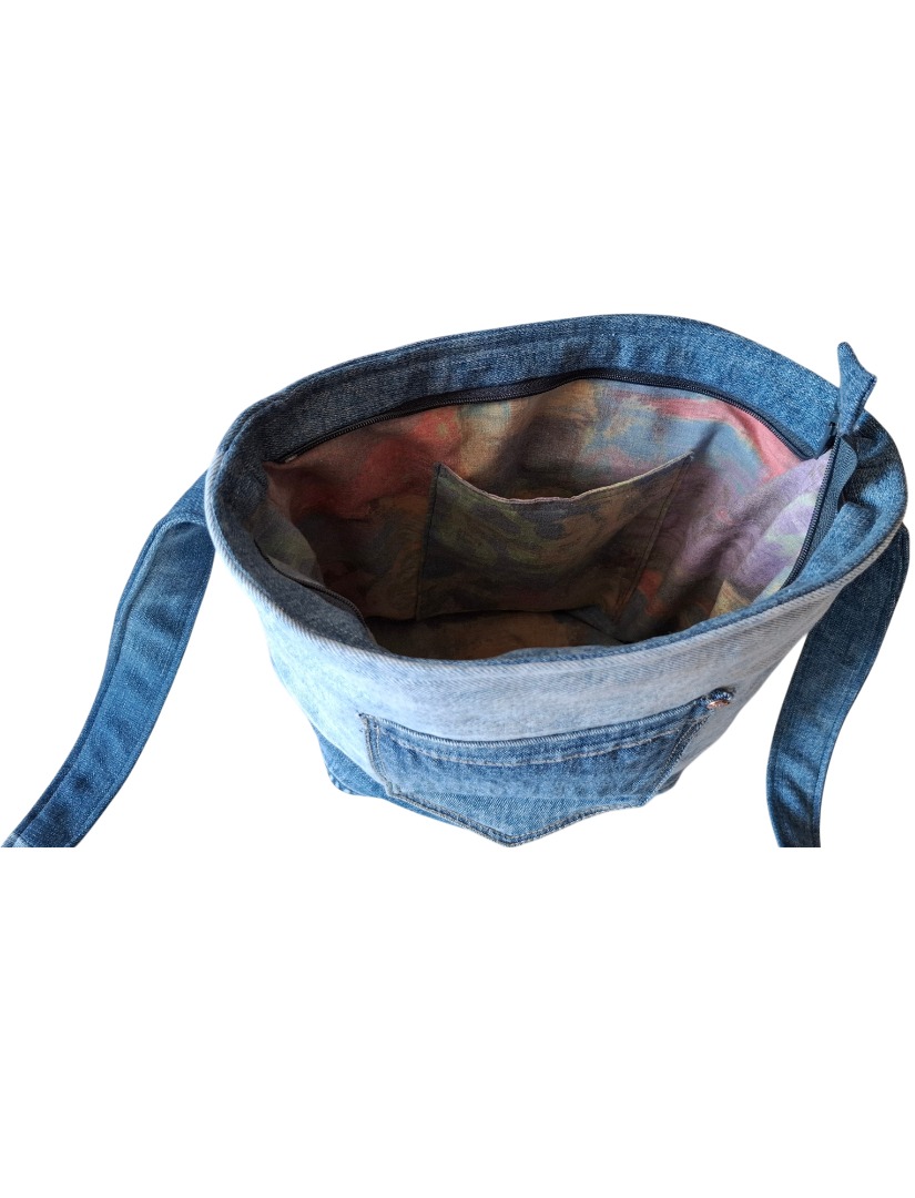 Deze tas is gemaakt van stevige, drie tinten blauwe spijkerstof. Op de voorkant zit een zak van spijkerstof en op de voering zit ook een zak. De kleur van de voering en de binnenzak bestaat uit verschillende zachte tinten (o.a. blauw, geel, rose) van dezelfde stof als de voering. Het materiaal van de voering is 100% katoen. De tas is voor en achter verstevigd met fleece . Het hengsel is ook van drie tinten blauwe, spijkerstof, aan elkaar gestikte stukjes stof. De lengte van het hengsel is ongeveer 1.20m. (ongeveer op heuphoogte).